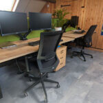 Een mooi contrast met al het groen en hout zijn de zwarte bureaustoelen van Interstuhl. Dit geeft de ruimte een stoere uitstraling.